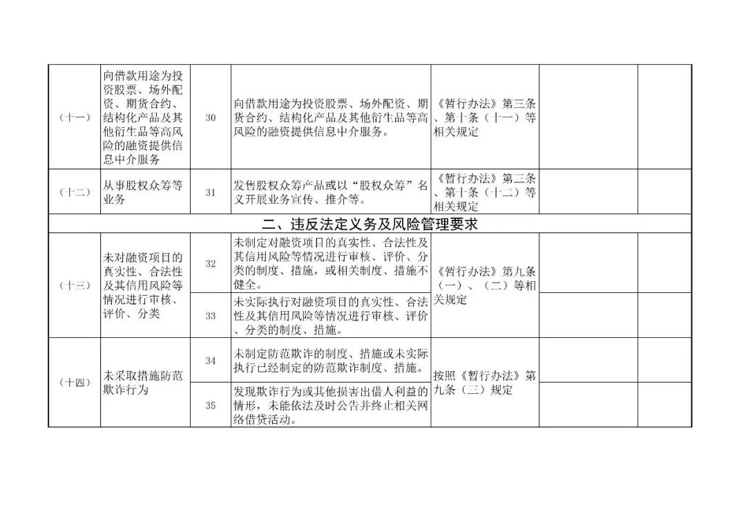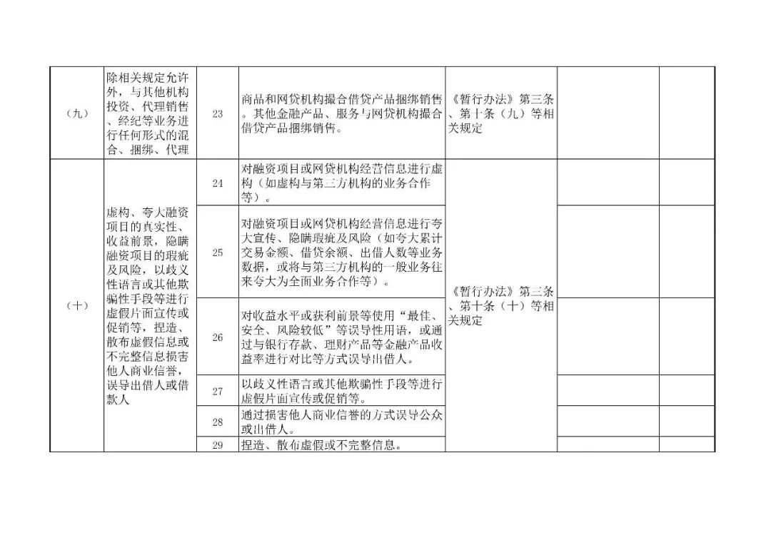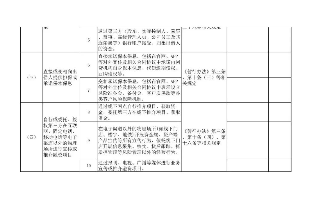 (二)重点内容。本次合规检查重点关注以下十个方面:1.是否严格定位为信息中介,有没有从事信用中介业务;2.是否有资金池,有没有为客户垫付资金;3.是否为自身或变相为自身融资;4.是否直接或变相为出借人提供担保或承诺保本付息;5.是否对出借人实行了刚性兑付;6.是否对出借人进行风险评估并进行分级管理;7.是否向出借人充分披露借款人的风险信息;8.是否坚持了小额分散的网络借贷原则;9.是否发售理财产品募集资金(或剥离到关联机构发售理财产品);10.是否以高额利诱等方式吸引出借人或投资者加入。