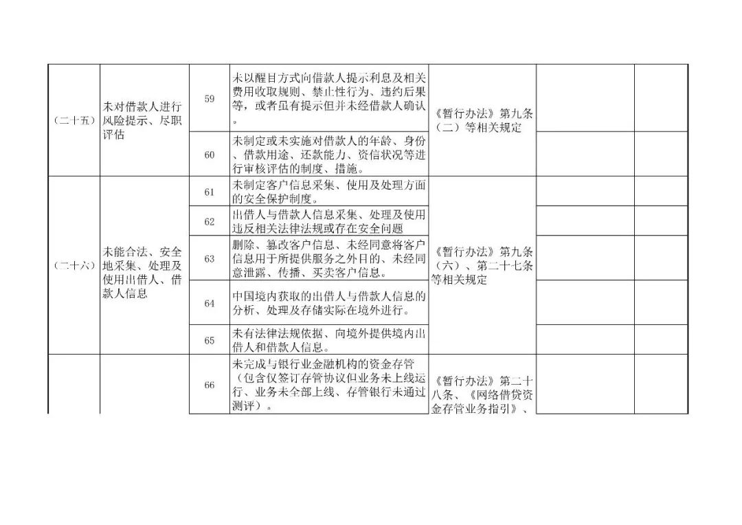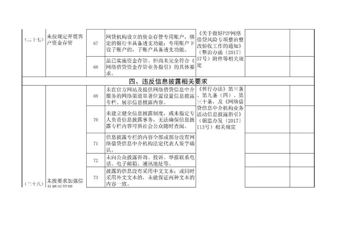 (一)检查依据。按照《网络借贷信息中介机构业务活动管理暂行办法》及资金存管、信息披露指引等要求,结合《网络借贷信息中介机构合规检查问题清单》(以下简称《问题清单》)严格执行。