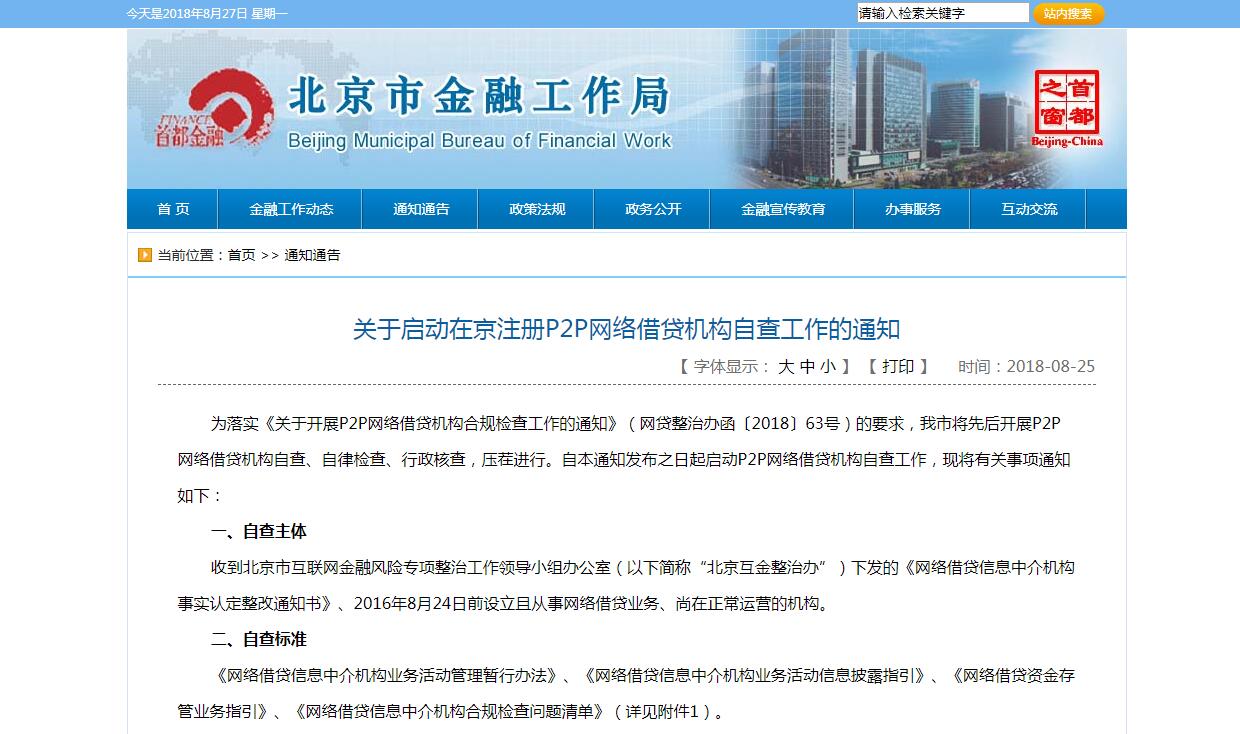 关于启动在京注册P2P网络借贷机构自查工作的通知