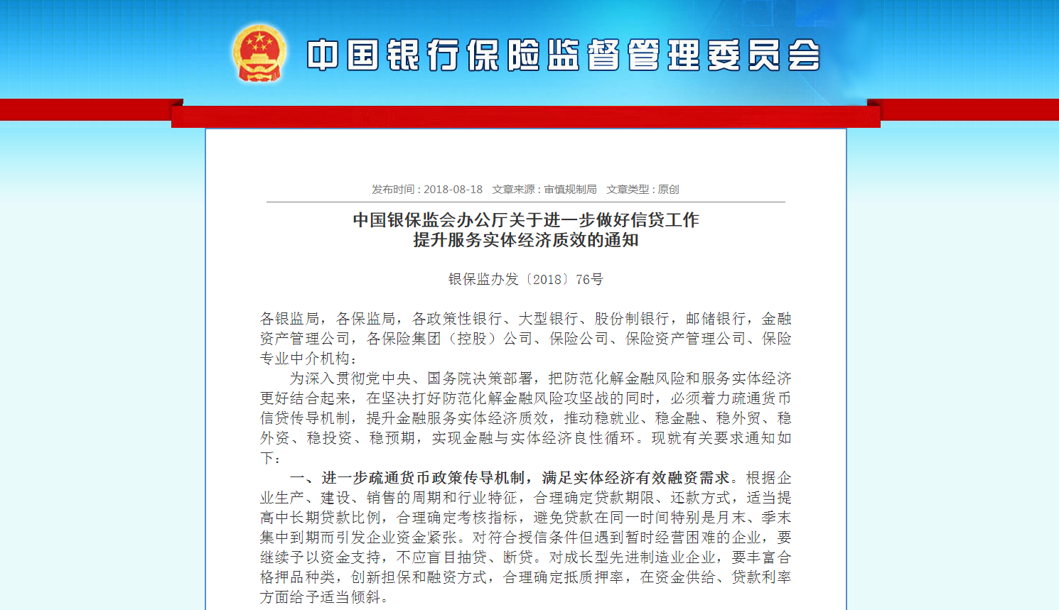 银保监办发〔2018〕76号